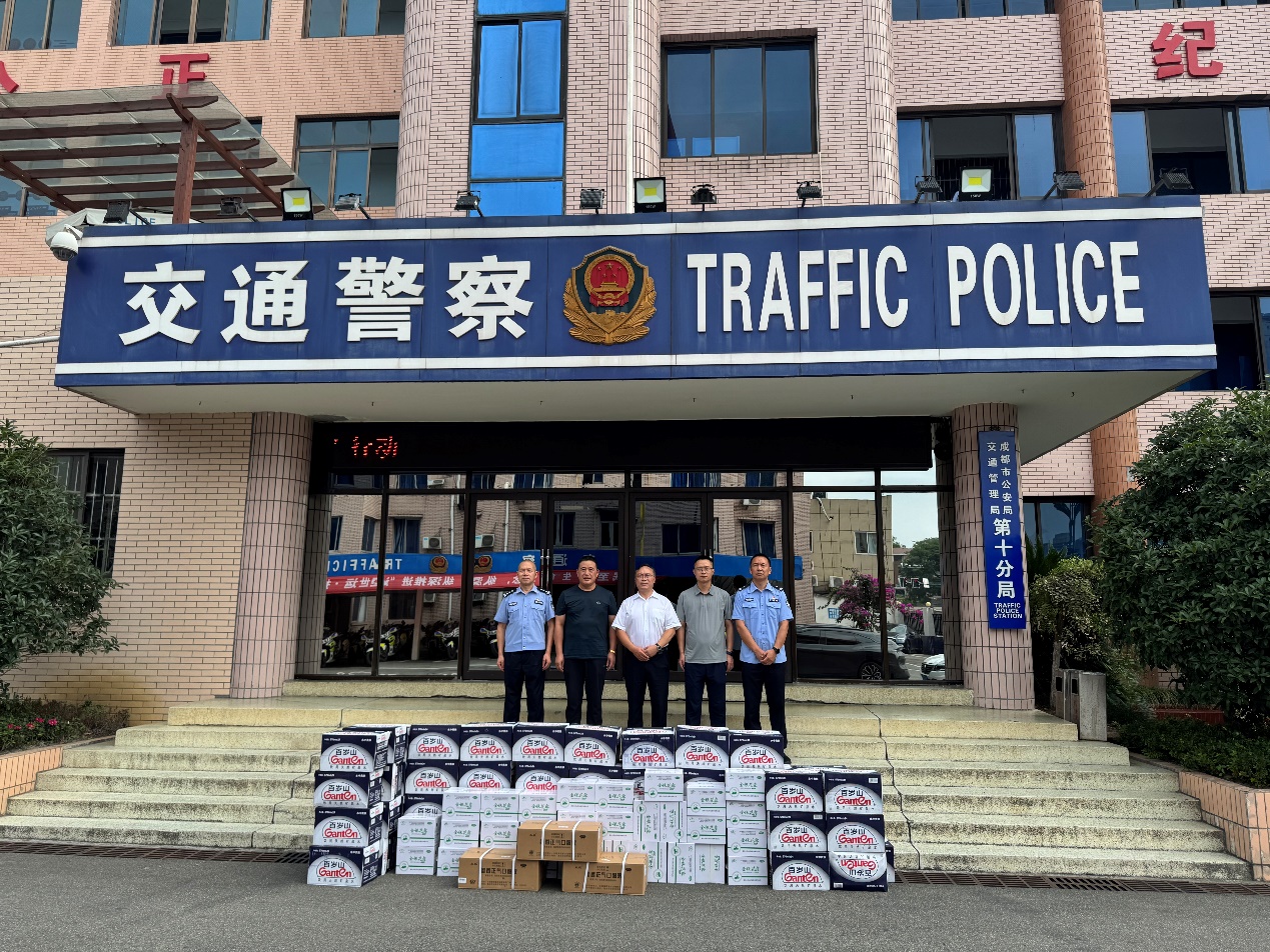 新都基地向交警十分局送去了矿泉水、藿香正气液、金银花露等防暑降温慰问物品,对交警不畏酷暑、坚守岗位,有效维护道路交通秩序,营造安全、有序的出行环境表示敬意和感谢。